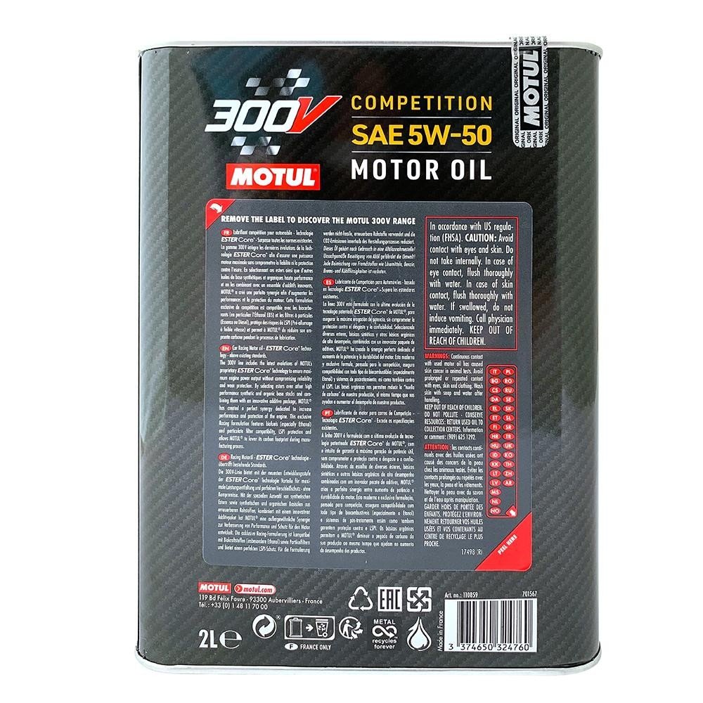 Motul 300V Competition 5W-50, atmosferik, turboşarjlı veya süperşarjlı, enjeksiyonlu (doğrudan veya dolaylı) ya da karbüratörlü tüm yarış benzinli ve dizel motorları için geliştirilmiş %100 sentetik bir motor yağıdır. Özellikle modifiye edilmiş motorlar ve geniş devir-sıcaklık aralığında çalışan yüksek performanslı araçlar için idealdir.