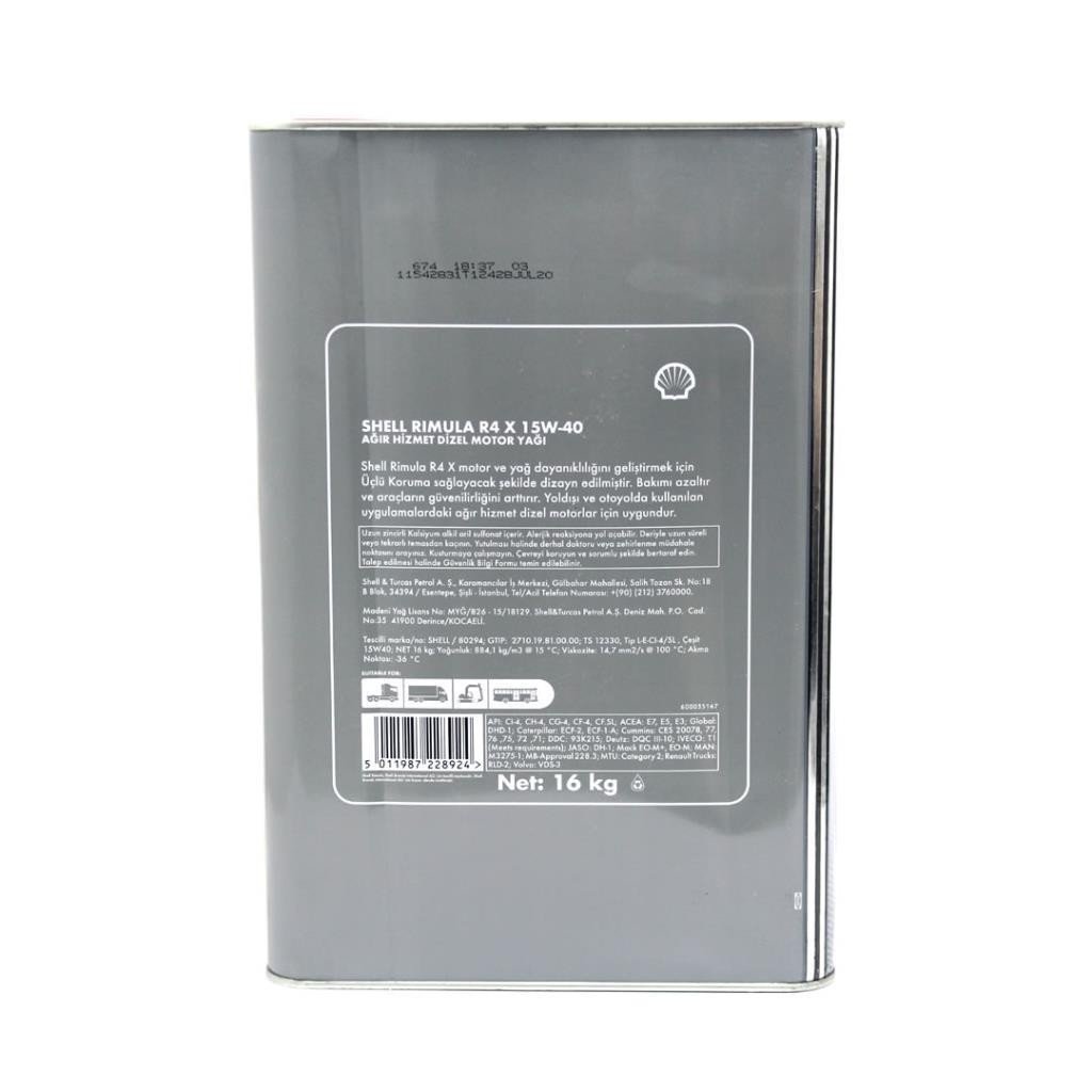Shell Rimula R4 X 15W40, yağın ve motorun dayanımını arttırmak amacıyla asit ve korozyon kontrolü, daha düşük motor aşınması ve depozit kontrolü ile üçlü koruma sağlayacak özel seçilmiş katık paketi ile geliştirilmiştir. Bu sayede araçların bakım masraflarının azalmasına ve aracın dayanımının artmasına katkıda bulunur. Turboşarjlı ve turboşarjsız ağır vasıta ve iş makinesi dizel motorlarına uygun olan Shell Rimula R4 X birçok motor üreticisinin onayına sahiptir.